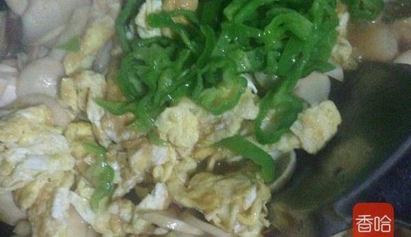 9.倒入事先炒好的雞蛋和青椒。