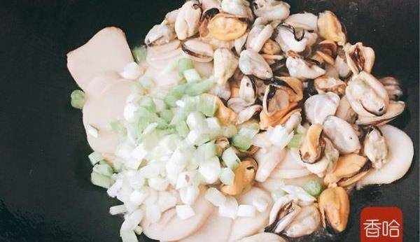 3.挖出淡菜肉處理幹凈,拉掉胡須,蔥切蔥花,杏鮑菇切片備用