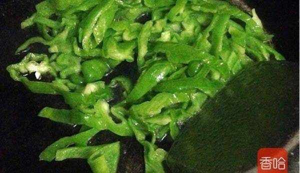 4.鍋裡加入適量的食用油,放入青椒快速翻炒後出鍋,備用。