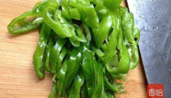 3.青椒去蒂,洗凈,切絲,備用。