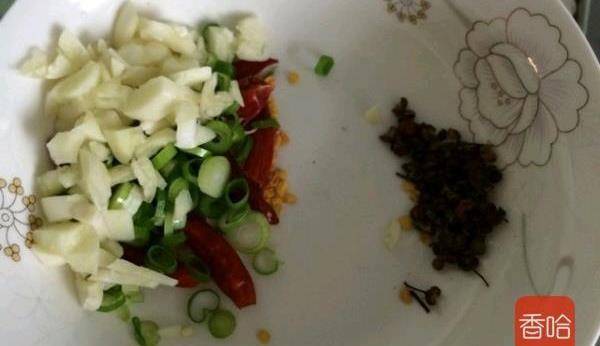 2.準備花椒粒,幹辣椒切段、蒜末、蔥花。花椒粒先放,所以和其他調料分開。