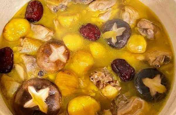 2.再把板栗剝好,和香菇紅棗一起清洗幹凈,紅棗記得去核,一起放入燉鍋,再放入兩塊薑片,加入適量清水。