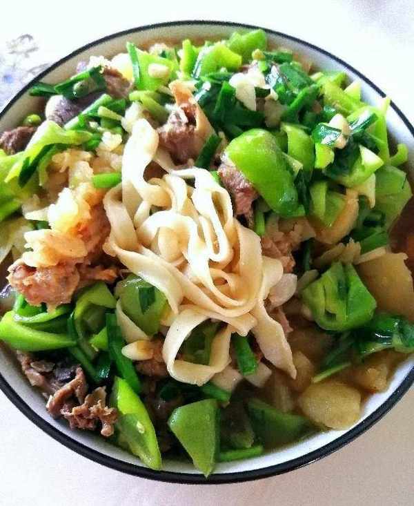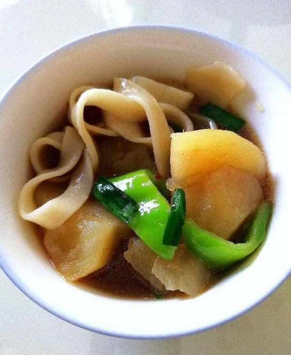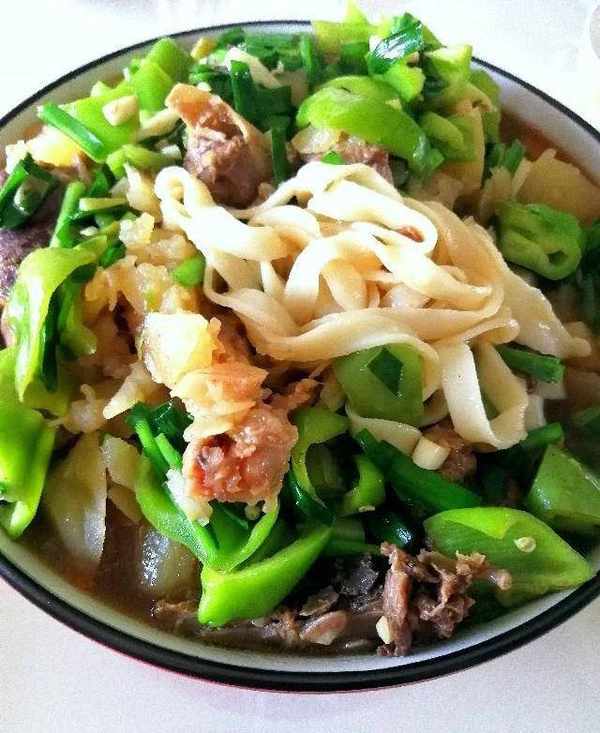 勁道的面條吸收瞭鴨肉湯的鮮香,吃起來分外的香,還有綿軟的土豆,鮮辣的青椒和提味的韭菜。吃起來特別的暢汗淋漓。