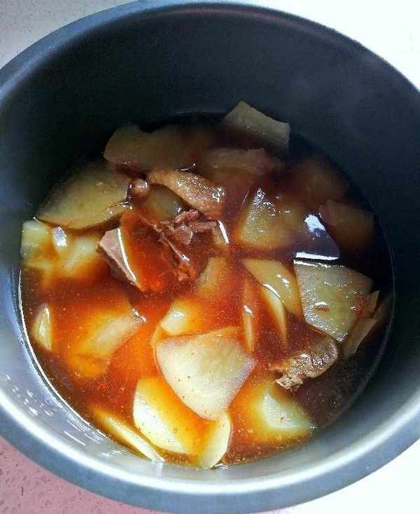四十分鐘後,鴨肉就燉好瞭,肉酥爛,湯鮮美,土豆綿軟入味,把燉好的鴨肉以及蔬菜湯全部倒入放面條的盆裡。