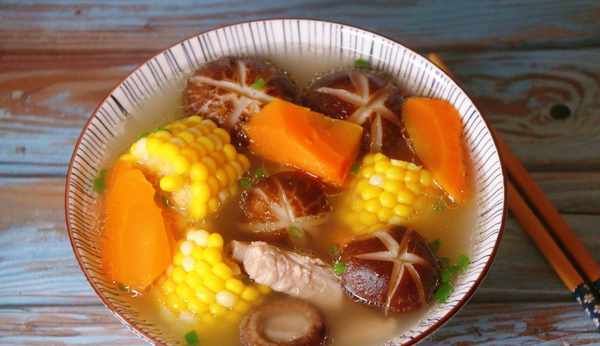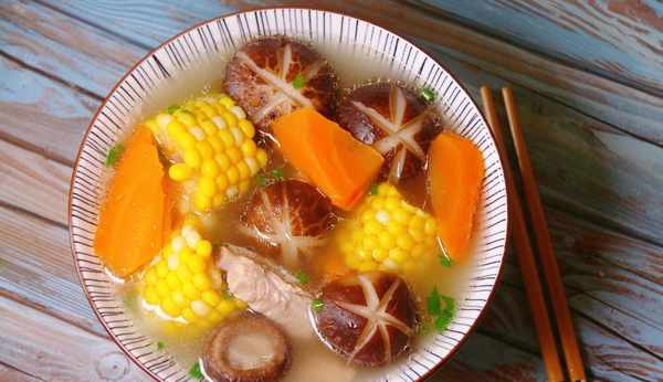 食材:排骨 400g、香菇 6個、胡蘿卜 1根、玉米 1根、薑 1塊、蔥 1根 鹽適量