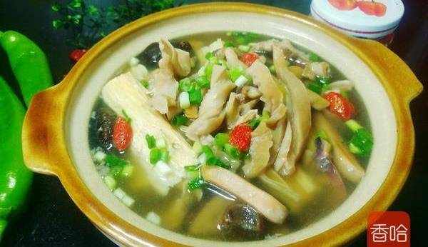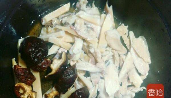 10.半小時後,加入腐竹和枸杞,鹽,攪動幾下,煮兩三分鐘,最後可以撒一點點雞精和胡椒粉。