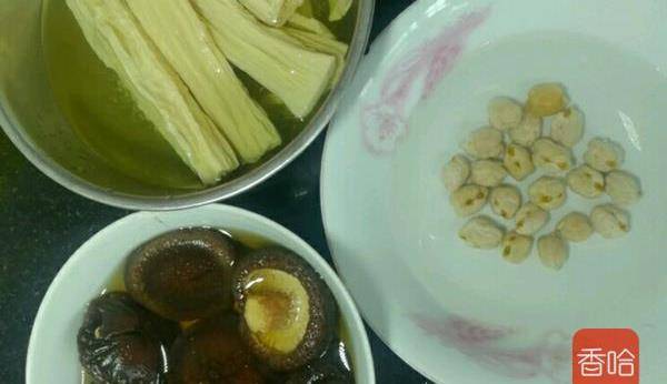 2.香菇洗凈,腐竹掰段,鷹嘴豆,提早泡發。