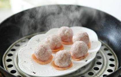 將做好的肉丸子放在胡蘿卜片上,裝入盤中。蒸鍋內加入適量的水燒開,放入肉丸子大火蒸8分鐘左右,熟透即可。