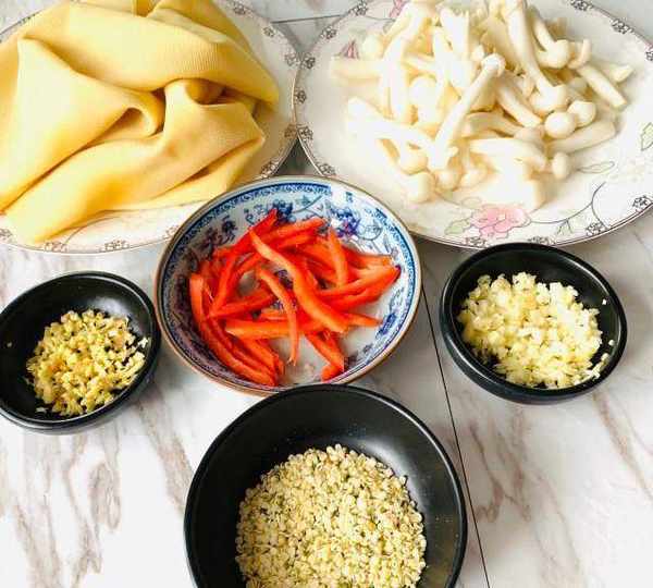 原料:豆腐皮、白玉菇、火麻仁、蔥、紅椒、薑、蒜末、蒸魚豉油、蠔油。