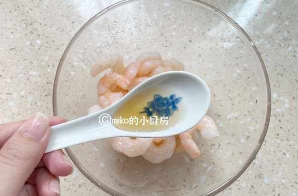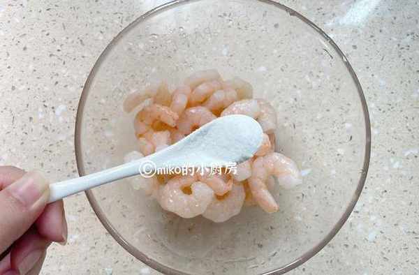 第一步:蝦仁提前解凍,清洗幹凈後放入1湯匙料酒,1茶匙鹽抓勻,靜置醃制15分鐘。