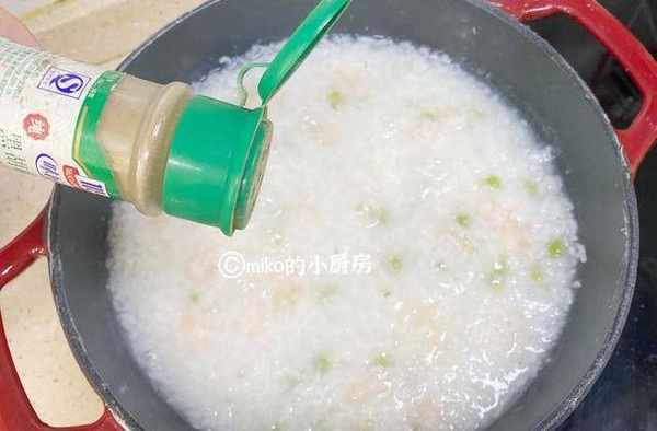 第四步:蝦仁粥出鍋前加入適量的胡椒粉攪拌均勻,胡椒粉可以增加粥的香氣,關火後加入適量的鹽調味即可。