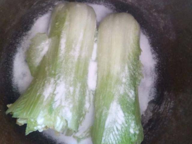 2、把醃菜的容器洗幹凈擦幹,然後在底部撒上一層粗鹽,然後把白菜擺放到容器中,每擺一層就撒一層鹽,擺滿之後最上面再撒一層鹽,最後壓石頭等重物,使白菜始終浸在水中,過七八個小時之後往容器中填滿清水,沒過白菜。