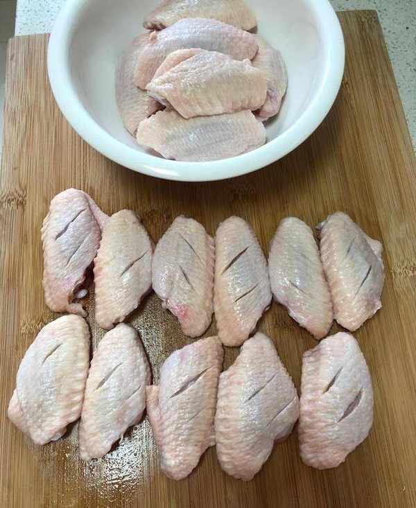 1、雞中翅解凍,清洗幹凈後,在雞翅正反面各劃上兩刀,讓雞翅更入味。