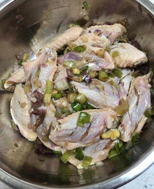 3、往雞翅裡放入大蔥、洋蔥、生薑,下入一點點的鹽(因為後面還要加奧爾良醃料,所以放一點點的鹽就夠啦),生抽一點點,白糖幾粒,胡椒粉,蠔油,抓拌均勻,醃制20分鐘。