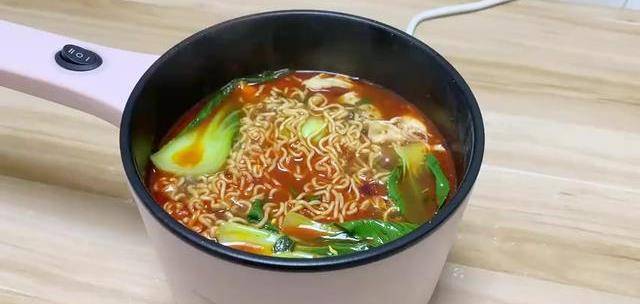 然後把方便面放進來,一邊煮一邊用筷子抖散,最後加入幾片油菜。倒進碗裡,一包方便面也能吃出新高度,這樣煮出來的方便面比泡的好吃多瞭,不信你們可以試一下。