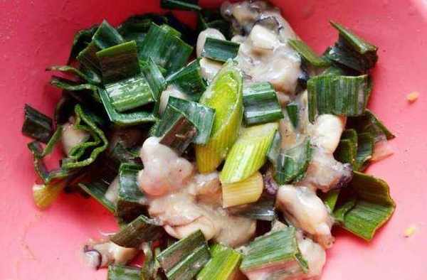 第一步:將蒜苗切成小塊。接著將海蠣洗凈,盡量瀝幹水分(水份太多導致地瓜粉用量變大,影響口感,海蠣煎還不易成型,導致失敗。)把蒜苗放入,加鹽少許,味精,生抽(我們這邊會放魚露少許,有的人吃不來魚露,可加可不加)料酒。攪拌均勻,最後倒入地瓜粉,吸幹水分。