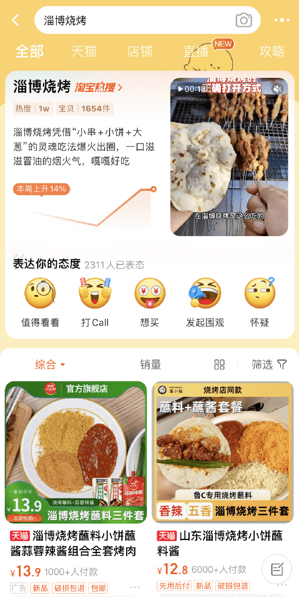 據淘寶數據顯示,幹碟蘸料、燒烤小餅等有關淄博燒烤同款產品銷量提升明顯,淘寶“淄博燒烤”的熱度也在一周時間裡上升瞭14%。
