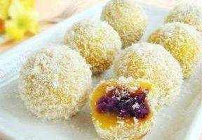 材料:紫薯、南瓜、糯米粉、色拉油、白糖、椰蓉