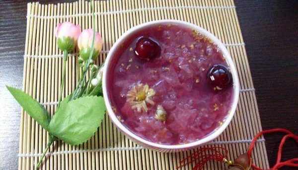 5、1小時後,銀耳已經煮得比較軟瞭,下入紫薯和冰糖,繼續煮45分鐘。至紫薯熟透,湯汁粘稠即可。冰糖的用量根據個人口味增減,如果是晚上喝,就不要放太多。