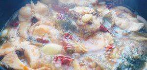 鍋內油熱下蒜瓣、薑片、花椒和幹辣椒爆香,然後加洋蔥炒香,最後加啤酒煮開。