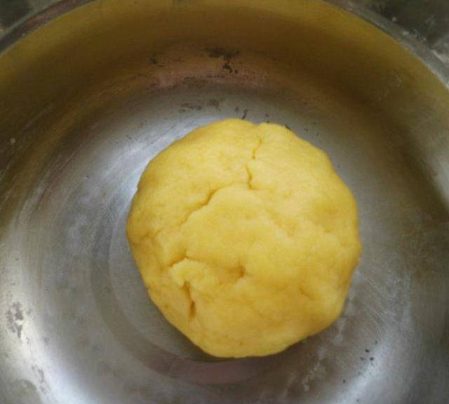 第3步、再加入主料中的蛋液,拌勻後將其倒入篩好的低粉中,和成面團,餳發20分鐘,此為餅皮部分。