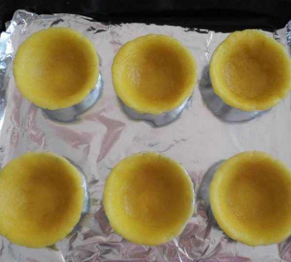 第11步、捏好的撻皮,本來應該用菊花模的,那樣才更像,可惜我沒有所以烤出來的就沒有人傢賣的漂亮。