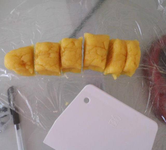 第9步、餳發好面團分成10等份,我隻拍瞭六份的照片,因為烤盤一次烤六個