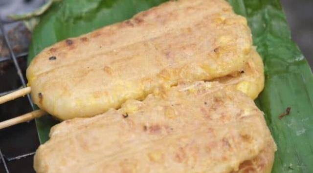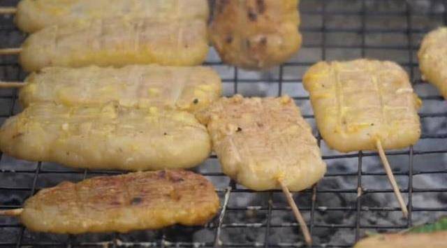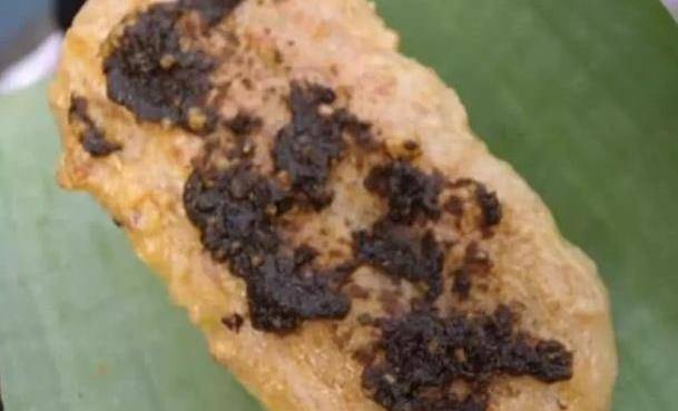 大嬸賣的這道小吃是手工做成的,和糍粑的做法差不多,隻不過這種小吃需要烤,烤的時候可以往上面刷上一點雞蛋液,一直烤到小吃表面變得金黃,而且聞著也非常的香,大嬸把烤好的小吃拿出來,放在芭蕉葉上,然後再往上面刷上一些做好的紅糖醬,也可以放辣醬,都可以根據自己的口味來選擇,每一種醬吃起來味道都很好。