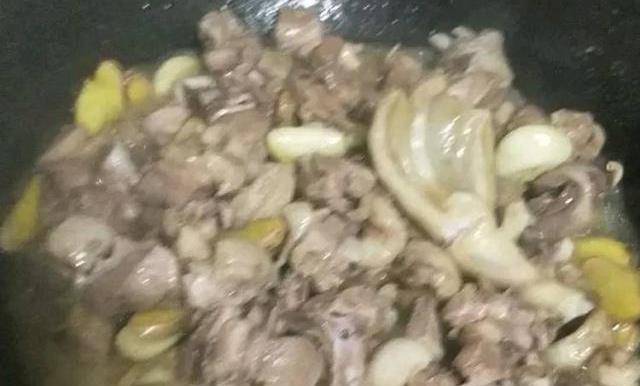 2、起鍋燒肉,鍋內放入一勺底油,油溫八成熱倒出,再放入半勺清油,下入鴨肉不斷的煸炒(這一步炒出來的鴨肉會特別香)