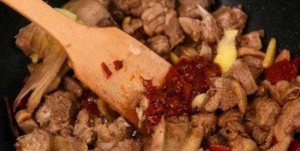 6、炒出紅油色放入鴨肉繼續煸炒,這時候煸炒鴨肉,是為瞭讓蔥薑和底料香味融入到食材中