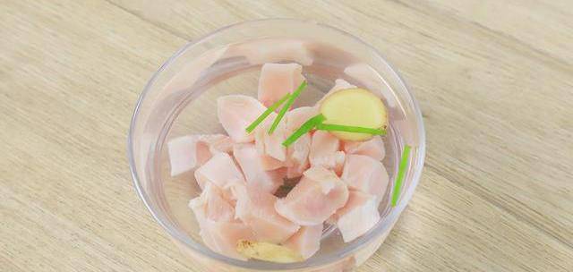 2、雞胸肉切小塊,放入蔥薑水中,浸泡去腥10分鐘。