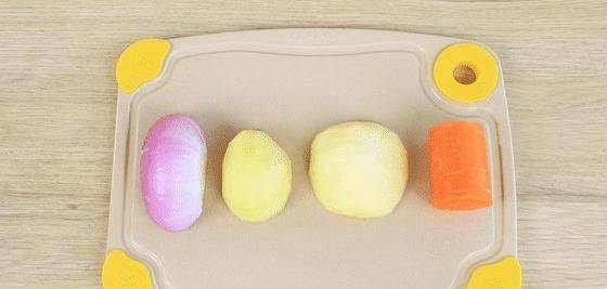 3、洋蔥切條,土豆和蘋果切小塊,胡蘿卜滾刀切小塊。