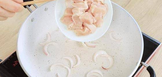 5、接著倒入雞胸肉塊,翻炒至肉塊表面顏色變白。