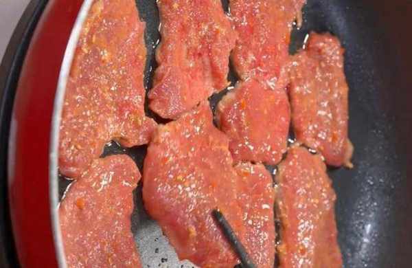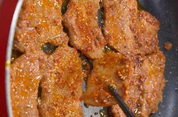 平底鍋開火加熱,放入食用油五層油溫擺入肉,小火慢慢煎,煎至兩面微黃熟透,這樣做的烤肉味道不輸外面賣的。烤牛肉地道入味,讓人回味無窮,誘惑味蕾,讓人食欲大開#廚房裡的江湖#