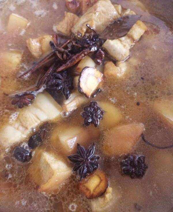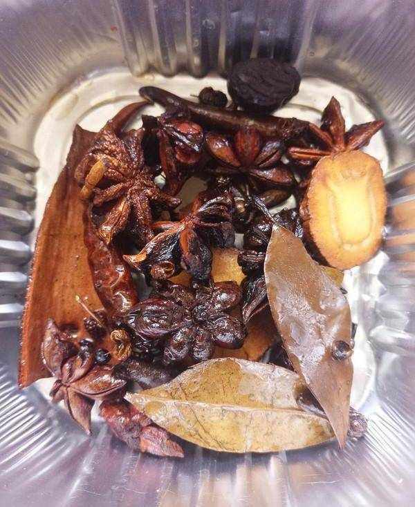 帶皮五花肉1000克、精鹽2茶勺、冰糖50克、花角5粒、桂皮10克