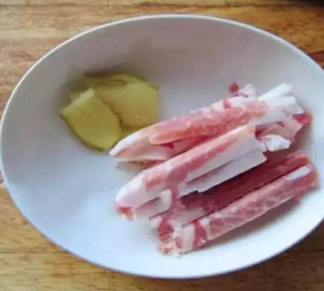 第2步、五花肉切略粗一些的絲,生薑切幾片。