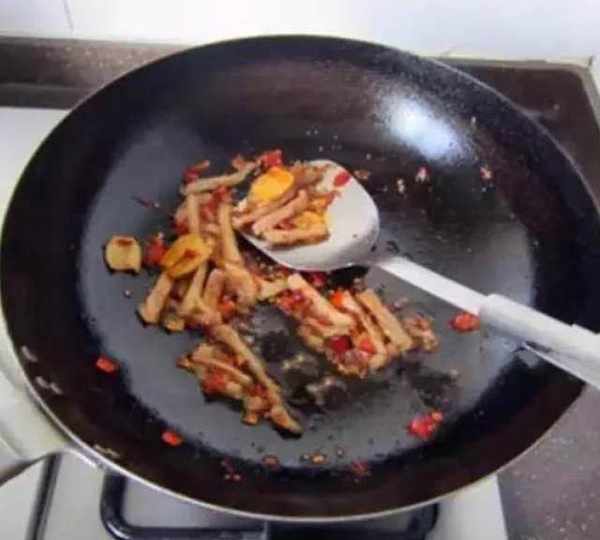 第5步、下入五花肉絲和薑片,炒至肉絲變色。