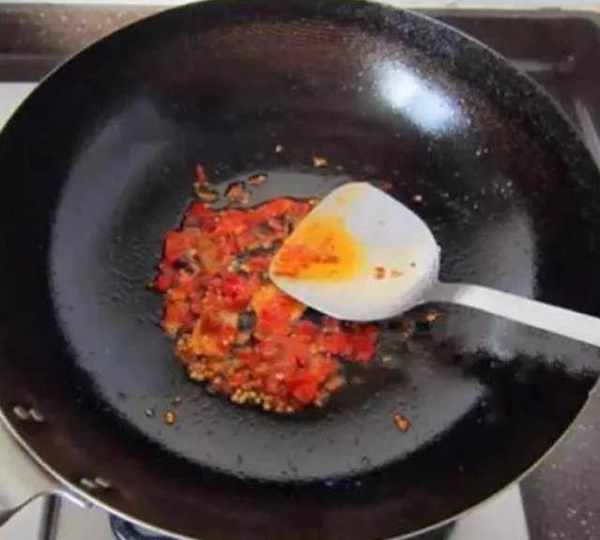 第4步、起炒鍋,熱鍋涼油小火爆香紅剁椒,至出紅油。