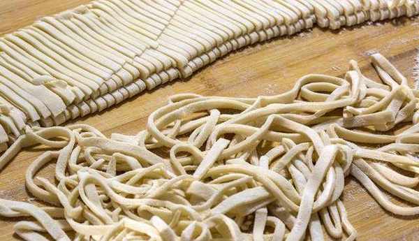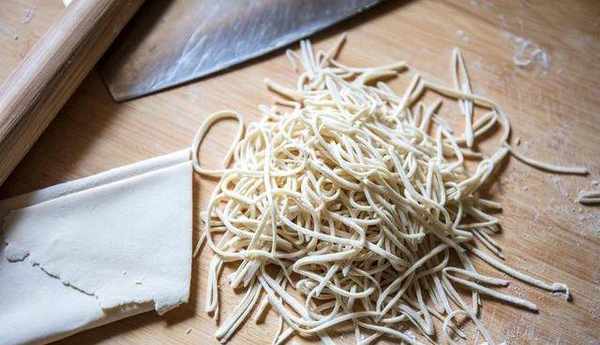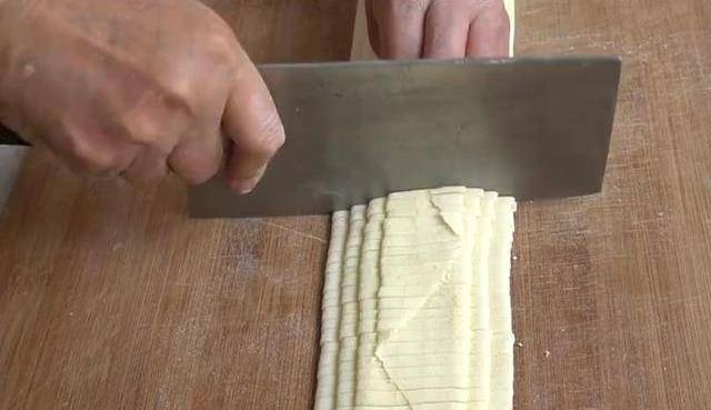 中間如果感覺有些黏連的話,可以在表面撒點幹面粉,最後像這樣薄薄的大圓皮兒就行瞭。表面撒上玉米面給它塗抹均勻,繼續卷在搟面杖上,像這樣一層一層的疊起來,用手輕輕的按壓一下,最後根據自己的喜好,切成細面條或者寬面條,把切好的面拾起來,抖掉多餘的面粉,手搟面的部分就做好瞭,鍋裡水燒開,把做好的面條下鍋,面條稍微定型,用筷子抖散開,等面條全部飄起來以後,蓋上蓋子,大火燒開,然後打開蓋子攪動一下,再煮一分鐘左右。