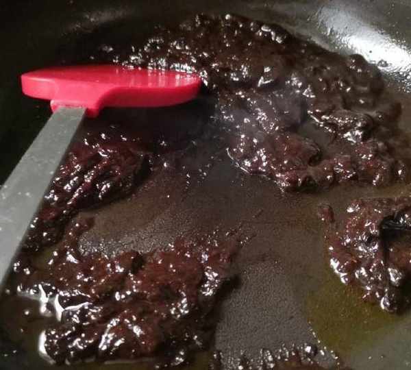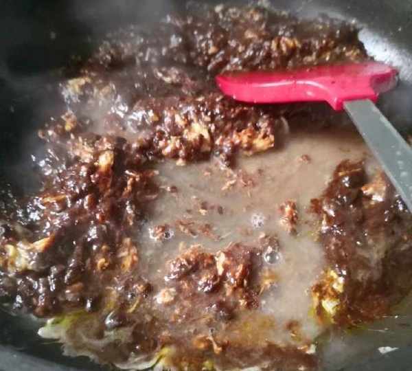第6步、最關鍵的一步就是加入清水,清水量不能太多,太多醬會稀,蘸食的時候會掛不住,水太少醬又會太稠,比較咸,加入清水的量是炒一會兒感覺醬流動性不太強,也不粘鍋為宜。