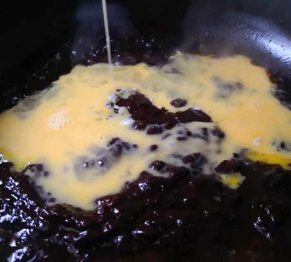 第5步、再把打散的雞蛋倒入鍋裡,稍等一下再翻炒,這樣雞蛋先成形一點再炒就不會全是沫沫瞭,如果等雞蛋完全成形再炒,那樣雞蛋與醬不能完好的融合在一起,會有一種醬炒雞蛋的感覺。