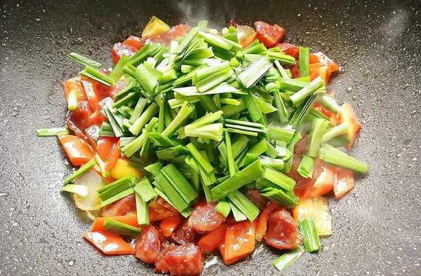 2,下入韭菜要快速炒出鍋,不用炒的太過熟透,韭菜受熱時間過長,影響韭菜的色澤和口感。