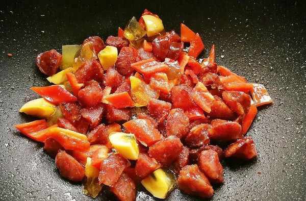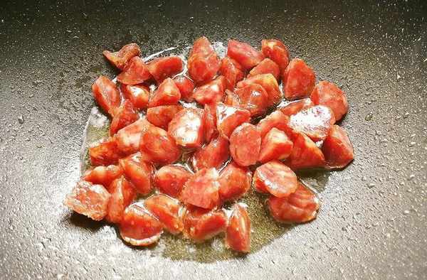 第二步,燒熱油鍋倒入少量油,小火加熱油溫,放入臘腸丁翻炒出香味,炒出臘腸的油脂,臘腸變深紅色,外表有些微焦就行。