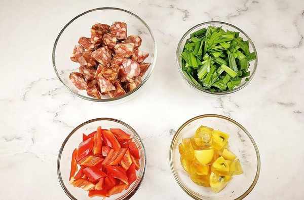 第一步,臘腸沖洗一下瀝幹水分,切成小丁,韭菜擇洗幹凈切掉老根,剩下的切小碎段,皮蛋剝去外殼切丁,紅尖椒洗凈去掉辣椒籽切丁。以上所有食材全部切成1厘米大小就可以瞭。