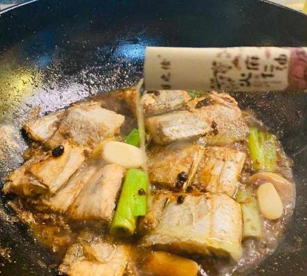 第4步、先用醋烹一下,放適量清水、料酒、鹽、糖、蠔油、老幹媽醬燒制入味。