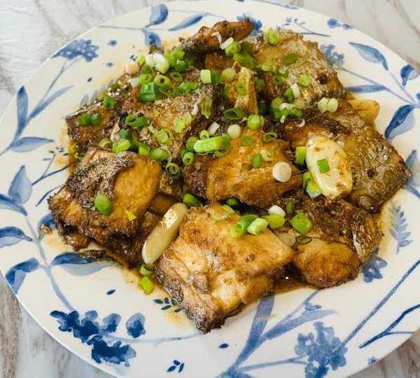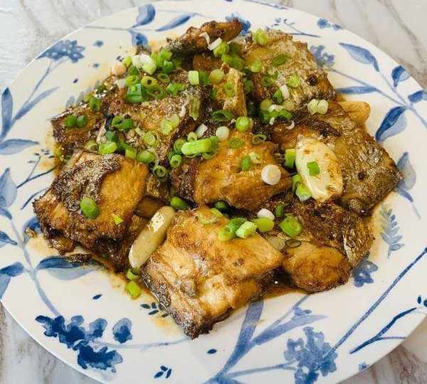 第6步、出鍋裝盤撒上蔥花增香,鮮嫩美味的快手燒帶魚做好瞭,可以盡情享用瞭。