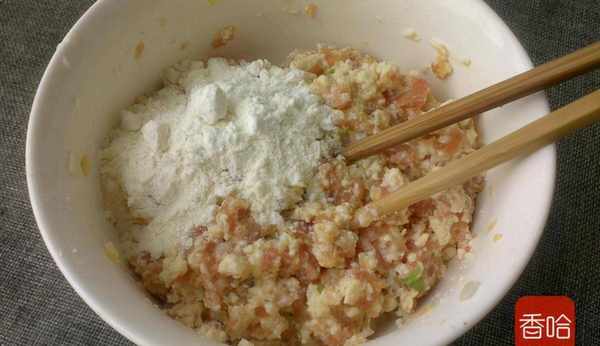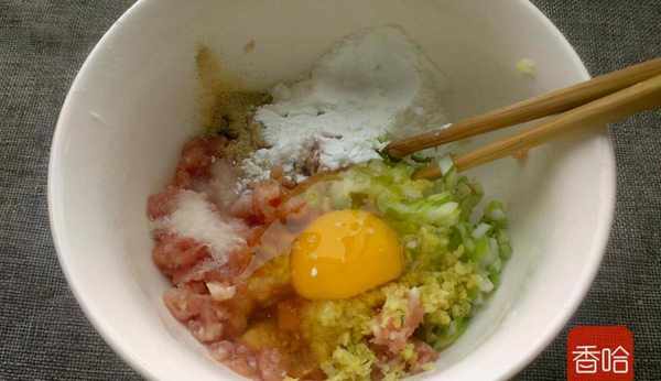1.豬肉餡放打碗裡,打入雞蛋,放鹽胡椒粉,淀粉,蔥薑末,順一個方向攪拌均勻