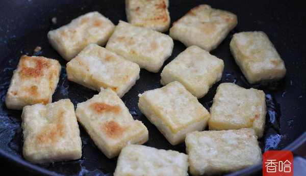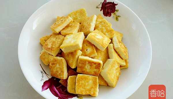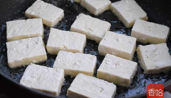 6.用小火將豆腐塊的兩面煎成焦黃色,盛出備用。