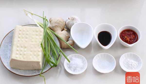 北豆腐500克、剁椒醬50克、玉米淀粉適量、薑2片、大蒜3瓣、蔥1根、食用油適量、醬汁材料: 、醬油1大匙、白醋2湯匙、糖1湯匙、玉米淀粉1湯匙、鹽少許、清水約80毫升