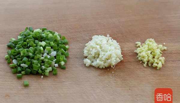3.小蔥切蔥花、大蒜和生薑分別切碎備用。